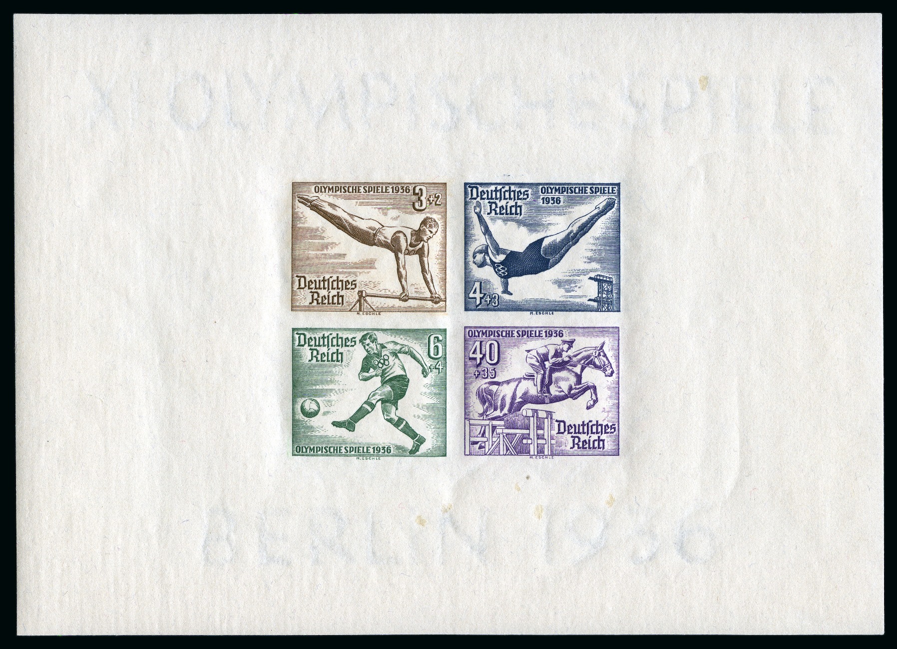 The 1936 Berlin Olympics has always been a popular Games to collect and it helps that there is a lot of material out there. For a new collector interested in the Olympics it’s the ideal one to start with as much of the material is very affordable and easy to find on collectables sites such as Ebay. And for the advanced collector with a bigger budget, there are some rarities to hunt for. In this sale we had three examples of the miniature sheet with the imperforate variety. Lot 10656 illustrated adjacent fetched the highest price, realising €9’500 against a Michel catalogue value of €20’000 an auction estimate of €6’000.