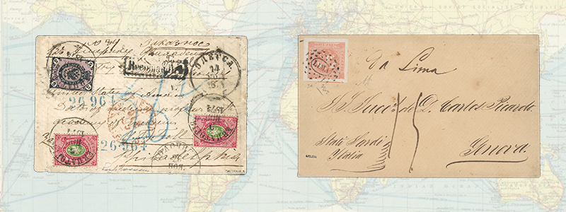 A cover which made a similarly arduous journey from Peru to Italy, via a northbound steamer from Callao, is Lot 10135. It then went onboard a steamship to St Thomas before being transferred to another steamer from Panama to Southampton (on the south coast of Britain), so it could be transported to France and on down to Genoa overland and is a unique, earliest recorded date of the Peru 1 peseta red, sent in 1858 tied to an envelope from Lima. It is a major exhibition item of the first issue of Peru, and has expert certificates from Emilio Diena (1981) and Brian Moorhouse (2010), the latter who gives a detailed explanation of the potential confusion of the rate at this early period on what is a complex route. The estimate is $3’000 to $5’000 and an exciting opportunity to acquire such a rarity from this fascinating period in mail to and from the Americas.