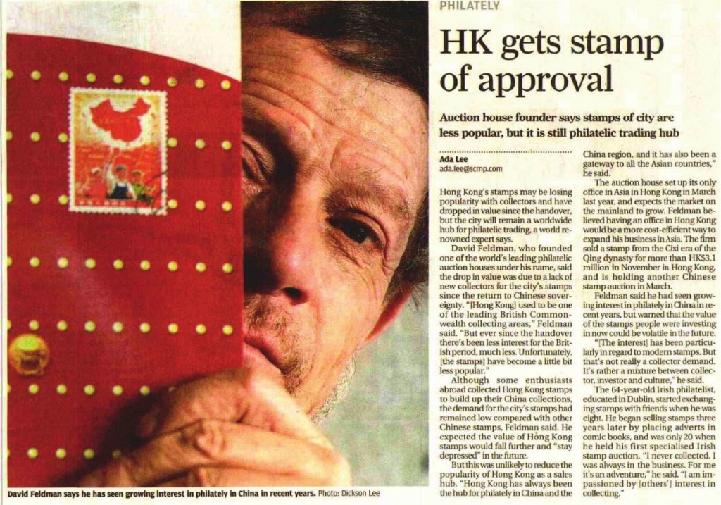 David Feldman gave his point of view to the South China Morning Post on January 16, 2012, on the philately development in Hong Kong. He says that stamps are less popular in HK, but it is still philatelic trading hub.