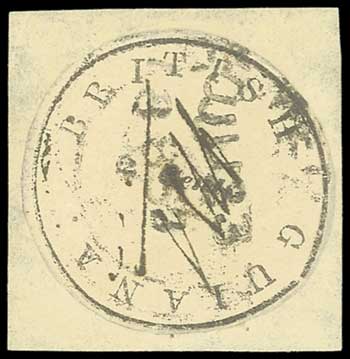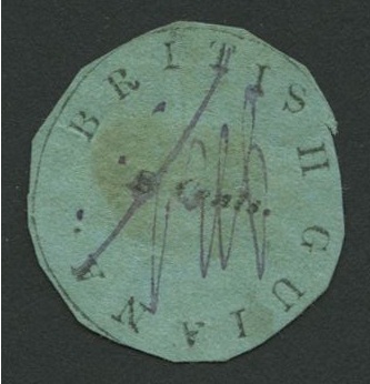 6. Printed circle, with 8 cents, in the centre and inscribed British Guiana, near the margin, on green paper (1850 ?)