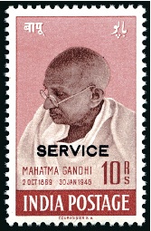The stamp, probably the finest remaining example out of only 18 known in existence today, was issued by the Government of India as a set of 4 commemorative stamps on August 15th, 1948 as a tribute to the father of the nation Mahatma Gandhi, who was assassinated in January of the same year . These were the first commemorative stamps of Independent India, and issued in 4 denominations  – 1 ½ / 3 ½  / 12 Annas, and the 10 Rupees. A set of only 100 10 Rs. stamps (in two sheets) were overprinted with “Service”, making these the world’s least printed stamp.