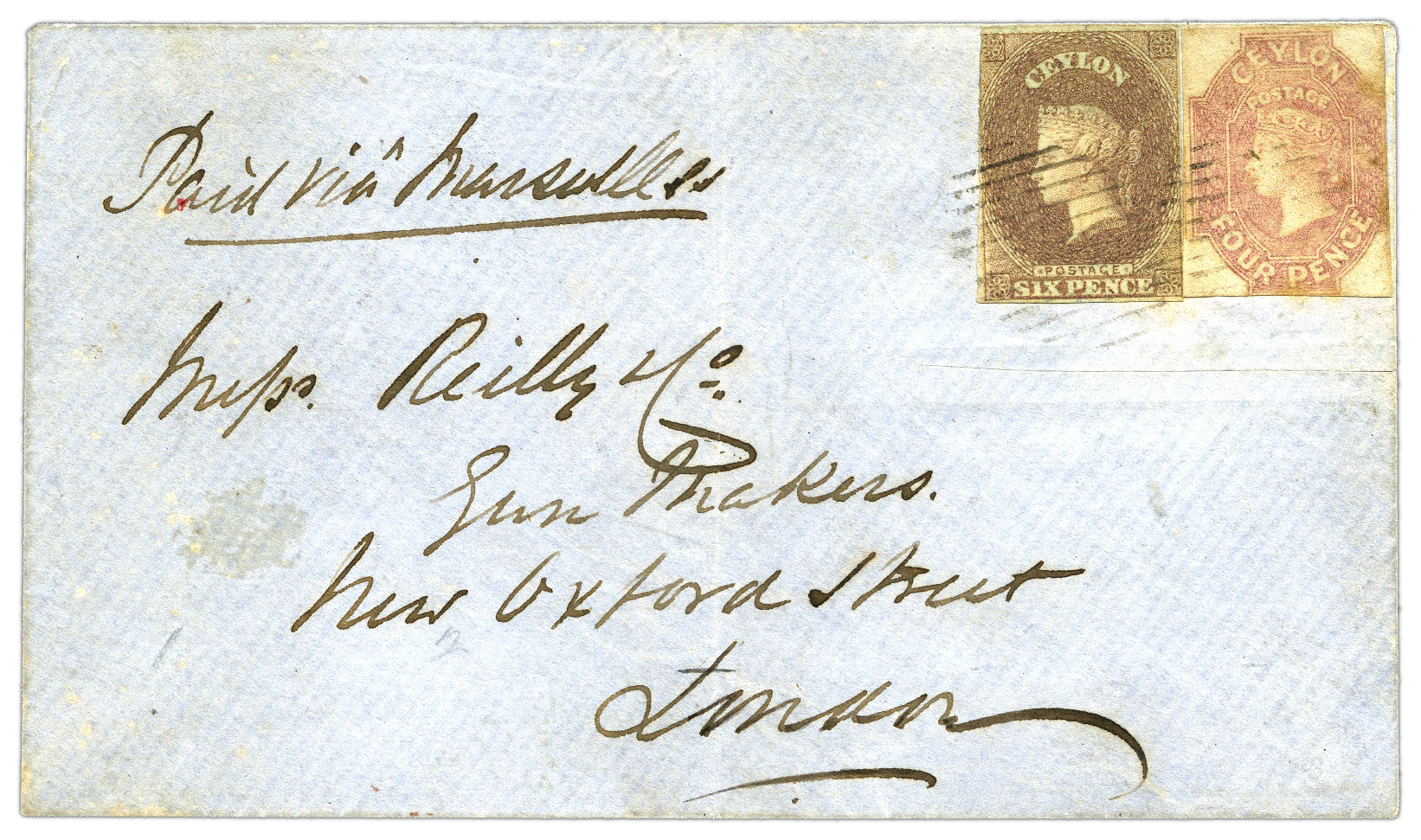 And because of our need to press on to our final destination in Great Britain and the British Empire, I’ll highlight just a few delights from the Charity event and urge you to take your time examining the itinerary in detail. So, with Christmas so nearly upon us, how about the earliest recorded philatelic game from 1868, which is lot 70000, or the largest multiple that can exist of the GB 3d on 3d and 6d on 6d in unique Post Office Sheets lots 70068 and 70069, or the finest unmounted mint Candian Chalon Head known as The Black Empress, which features in our rarity of the week article, lot 70011. And there is Lot 70015 – Ceylon 1859 envelope from Pusilawe to England with a 1857 4d rose and 6d on blued paper, an extremely rare franking and an exhibition showpiece.