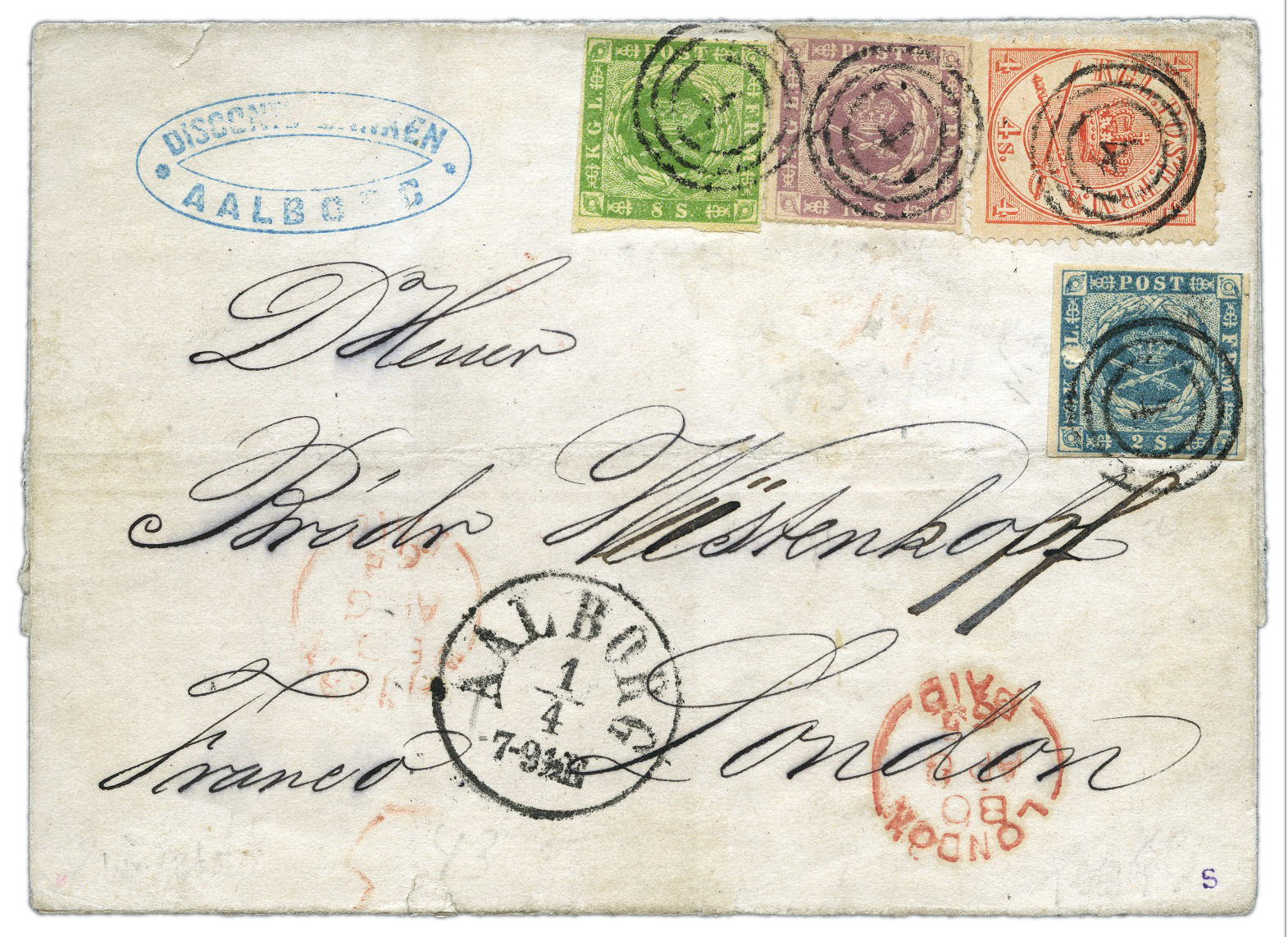 We’ve also done a good Italian job, with Italy, Italian States and Italian Colonies making up a spaghetti of over 200 lots with the featured item coming out of the rich territory of Sicily – Lot 40311 – in the Italian States section – a rare opportunity to bid on a 1859 1/2gr Orange, plate I on porous paper, in this L-shaped strip of 6. If you need a shot to wash all that down, then we’ve Russia and the Soviet Union distilled into an absolute ethanol of 53 lots from Imperial through to Zemstvos. Scandinavia gets a reliable and practical selection with Sweden making up 20 stops, Norway with 7, and although Denmark has a humble 2 lots, there is this rather colourful 1865 (April1) Cover from Aalborg to London which is lot 40031.