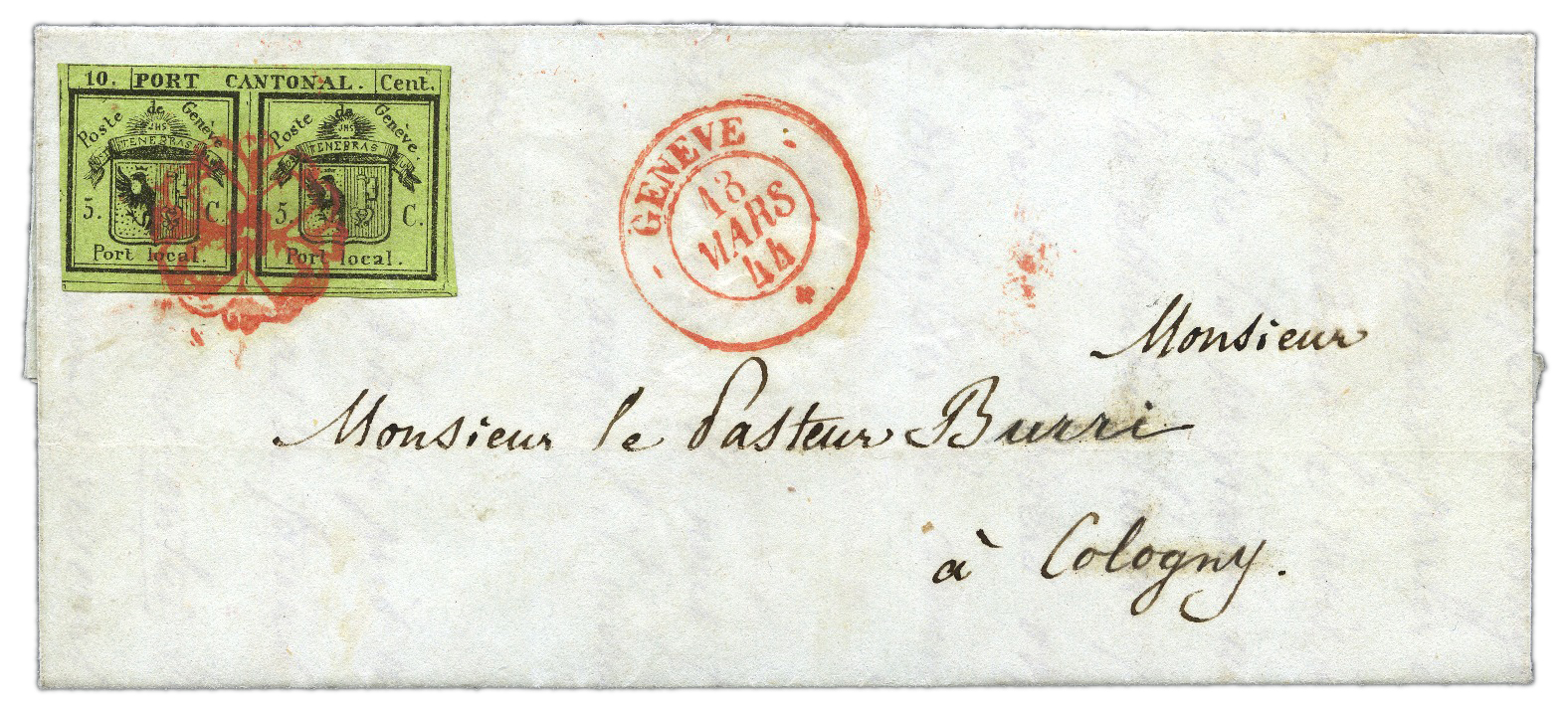 Then after a very efficient lunch hour, day two’s afternoon travel take us appropriately across the west border into the clear air of Switzerland where there are 265 lots with numerous philatelic lakes, villages and the high peaks to challenge your restraint, which let’s be honest wouldn’t be very hospitable of us at David Feldman unless it at the very least featured a bit of Double Geneva and despite the rarity of this issue our itinerary does indeed take in these little green nuggets of twinning, the featured example a show stopping 1843 5 + 5 c on a complete folded letter with that perennial red rosette of a cancel setting the heart racing.